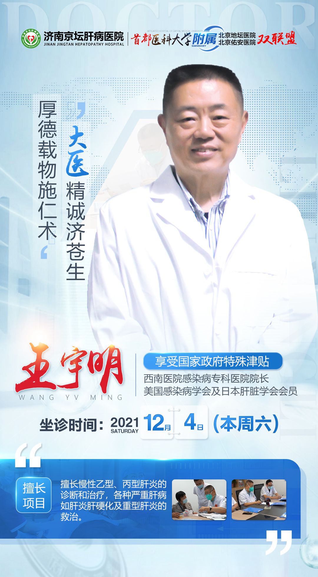 值此活动期间,我院邀请国务院津贴专家王宇明教授坐诊我院,为齐鲁肝病患者一对一制定针对性诊疗方案,帮更多肝病患者走出病痛、重获健康,坐诊时间为12月4日,名额有限,建议提前咨询预约 !